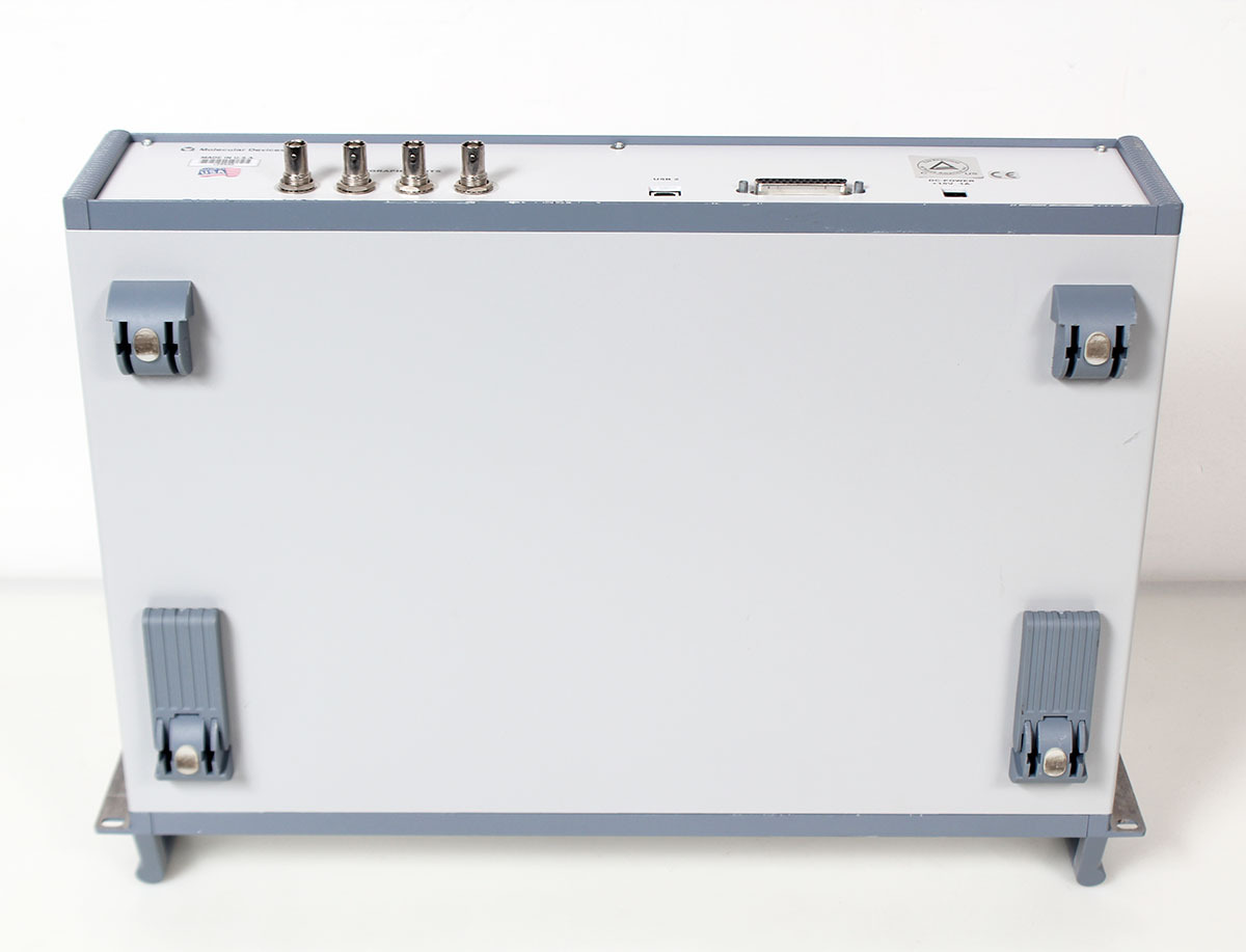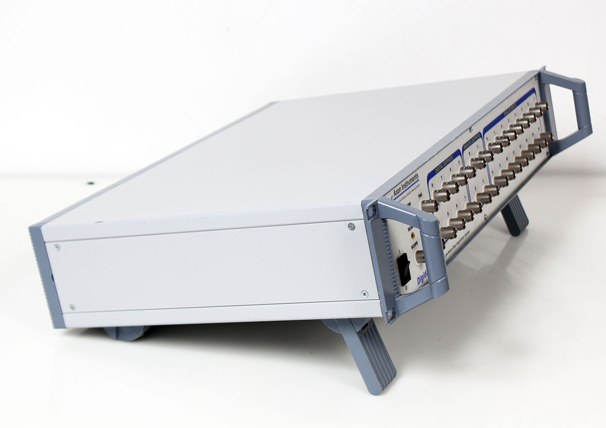 The Digidata 1440A Digitizer is contained within a rack-mount case, but it also has adjustable bayonet feet for use on a desktop.