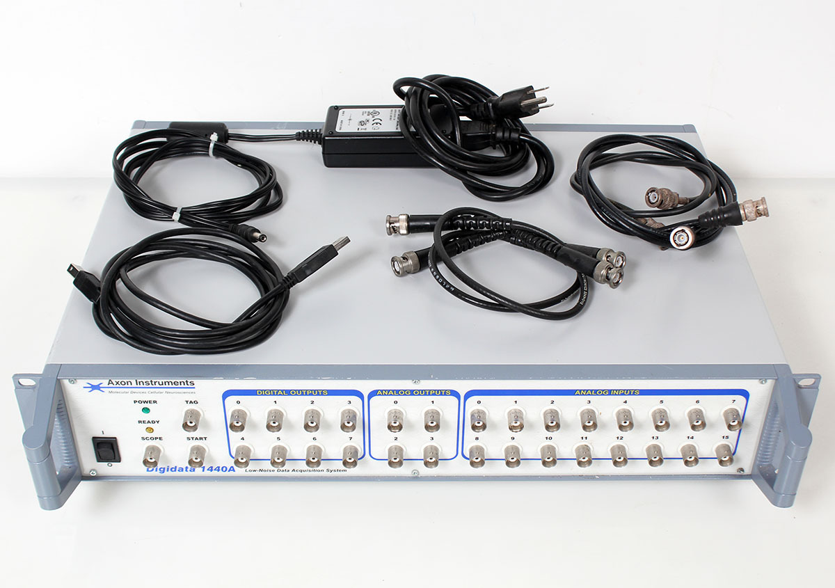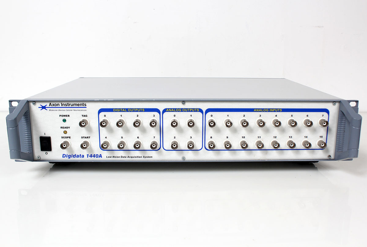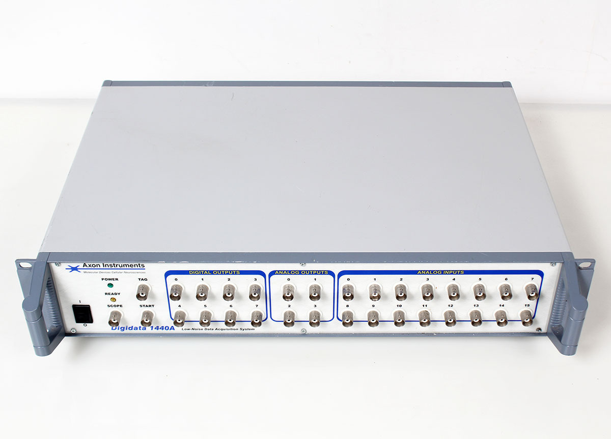The Axon Digidata 1440A is a low-noise, 16-bit data acquisition system designed for precision electrophysiology, providing 16 analog inputs, 4 analog outputs, and 8 digital outputs via a USB 2.0 interface