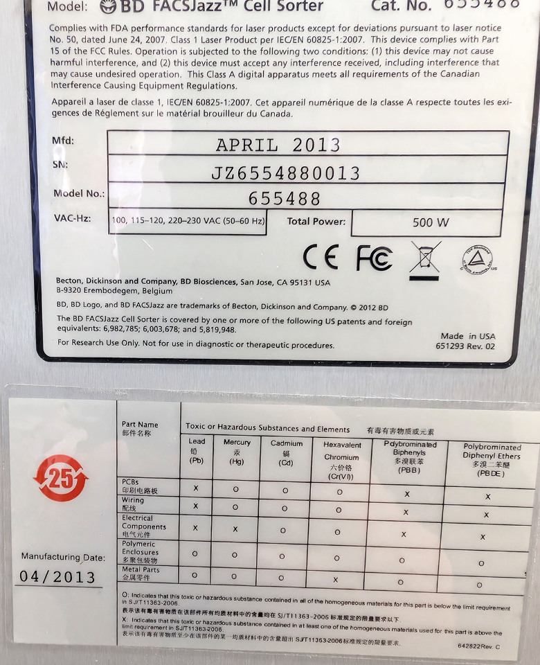 Additional notes: Computer and software work with FACSJazz and BD Influx systems. Production of the FACSJazz has been discontinued by BD. According to their website, supplies, parts and support are still available.