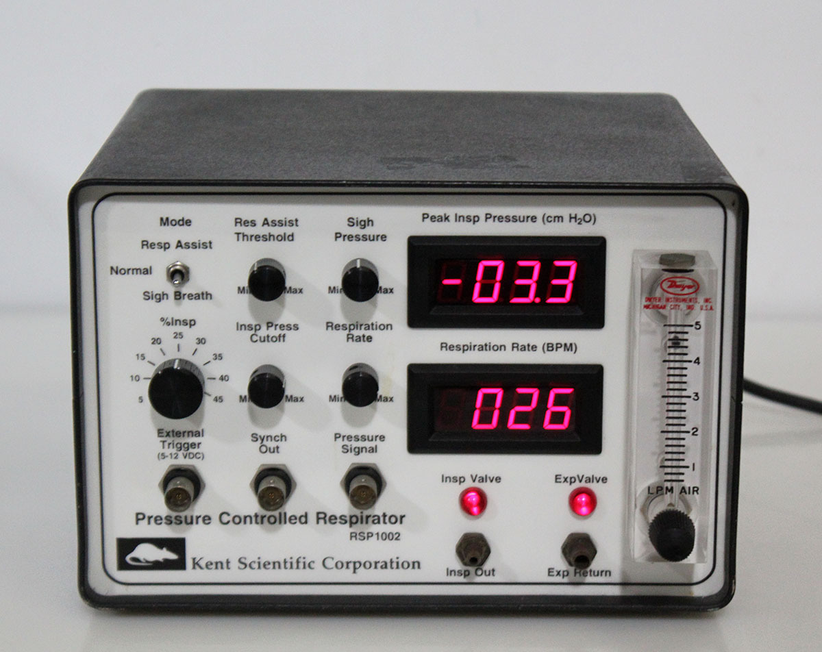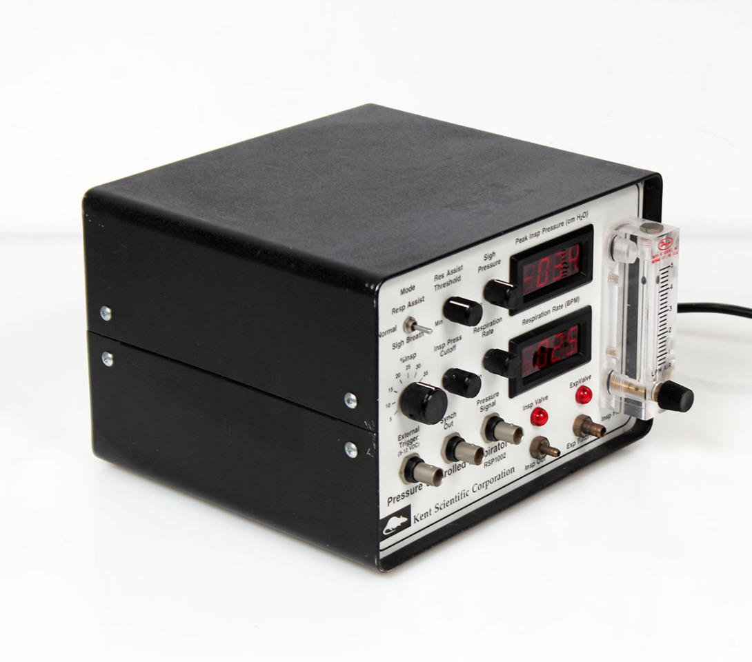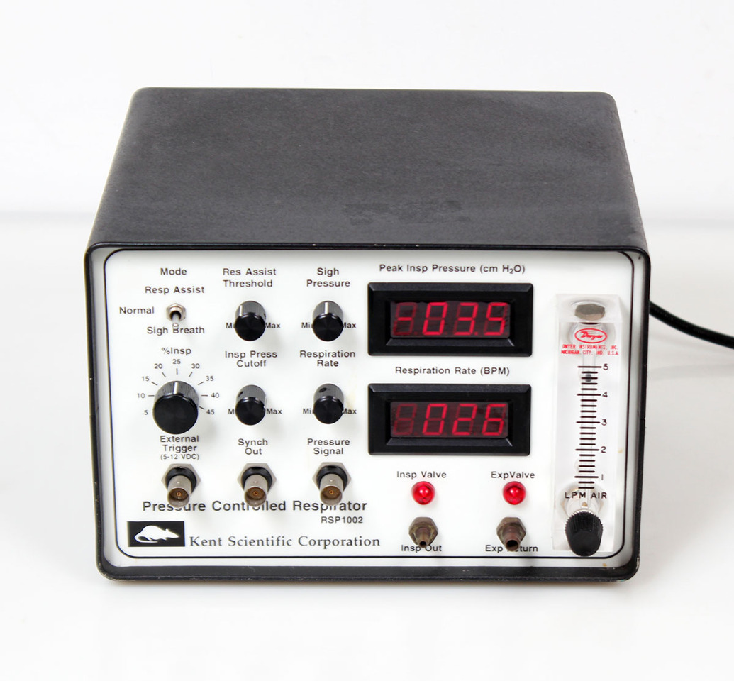 The Kent Scientific RSP-1002 is a pressure-controlled, volume-constant respirator designed for small animal research, such as rabbits or rodents, frequently used for procedures requiring controlled ventilation (e.g., 30 breaths/min, 10 mL/kg tidal volume). It offers specific pressure settings, such as 30 cm H2O positive end-expiratory pressure, and is designed for ease of intubation.
