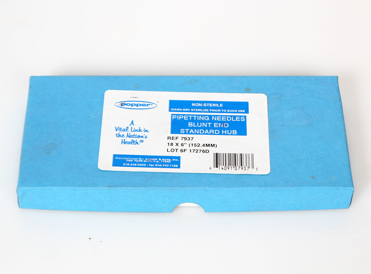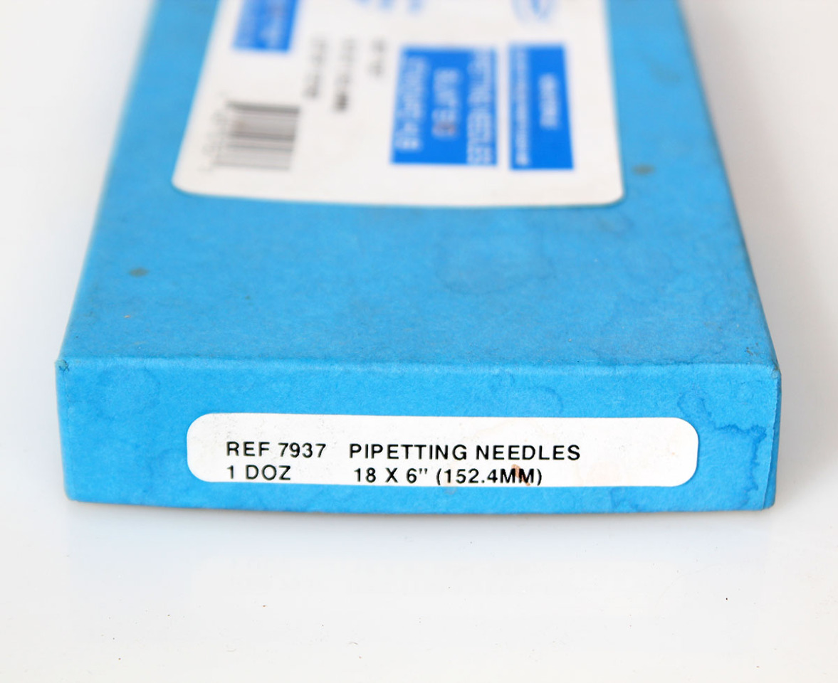 The Popper 7937 pipetting needle (now Cadence Science) is a laboratory needle with an 18 gauge (18G), 6-inch (6") length, featuring stainless steel construction, blunt end and standard (PS) hub. Used with volumetric dispensers for accurate liquid handling.