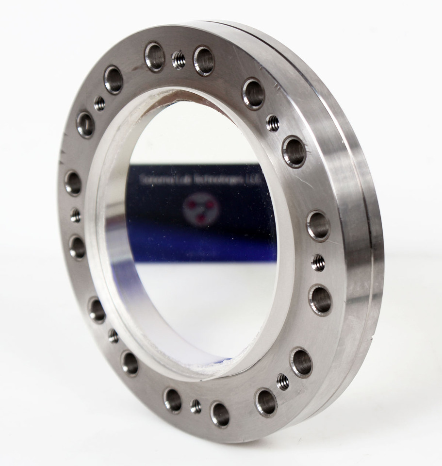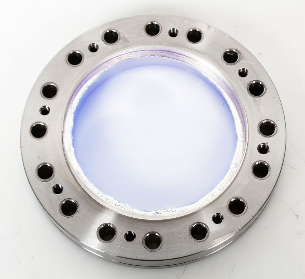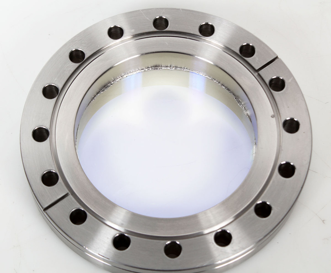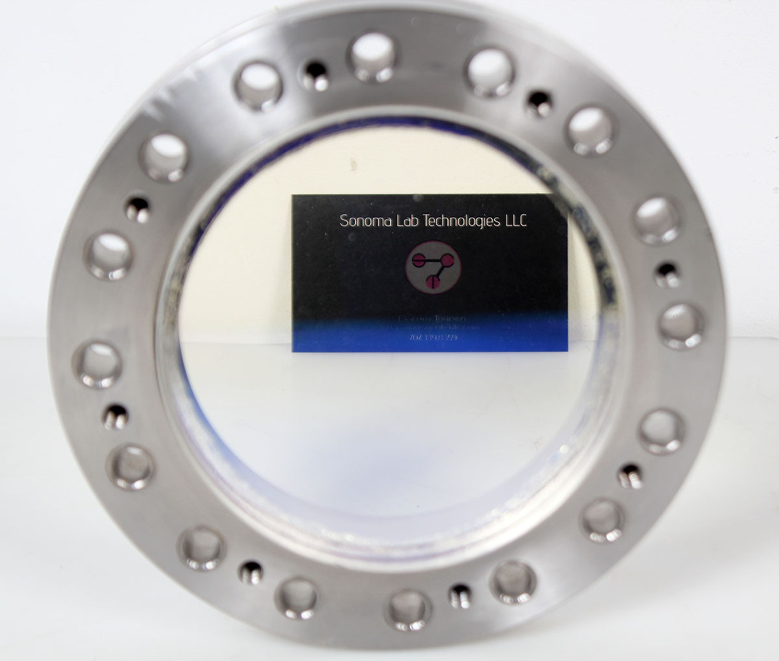 Nice viewport blank in excellent condition. This ultra high vacuum, SS304 vacuum viewport flange is extremely clean. The knife edge is excellent. Glass is blemish free and has a lens coating that produces a light pink/purple hue. It is also slightly angled in the flange, as shown in photos.