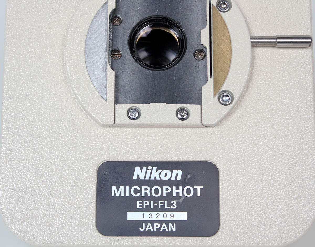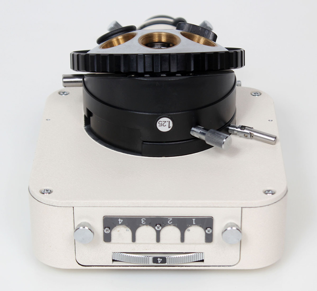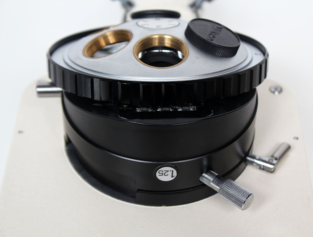 Clean and in good condition. Sliders and adjustments all functional. Included nosepiece turret for RMS threaded objectives rotates easily and clicks in place at each position. Comes as shown without filter cubes.
