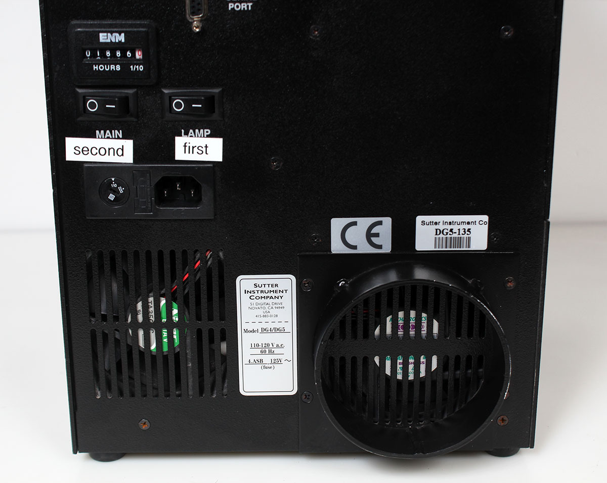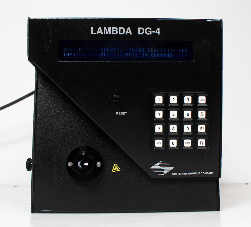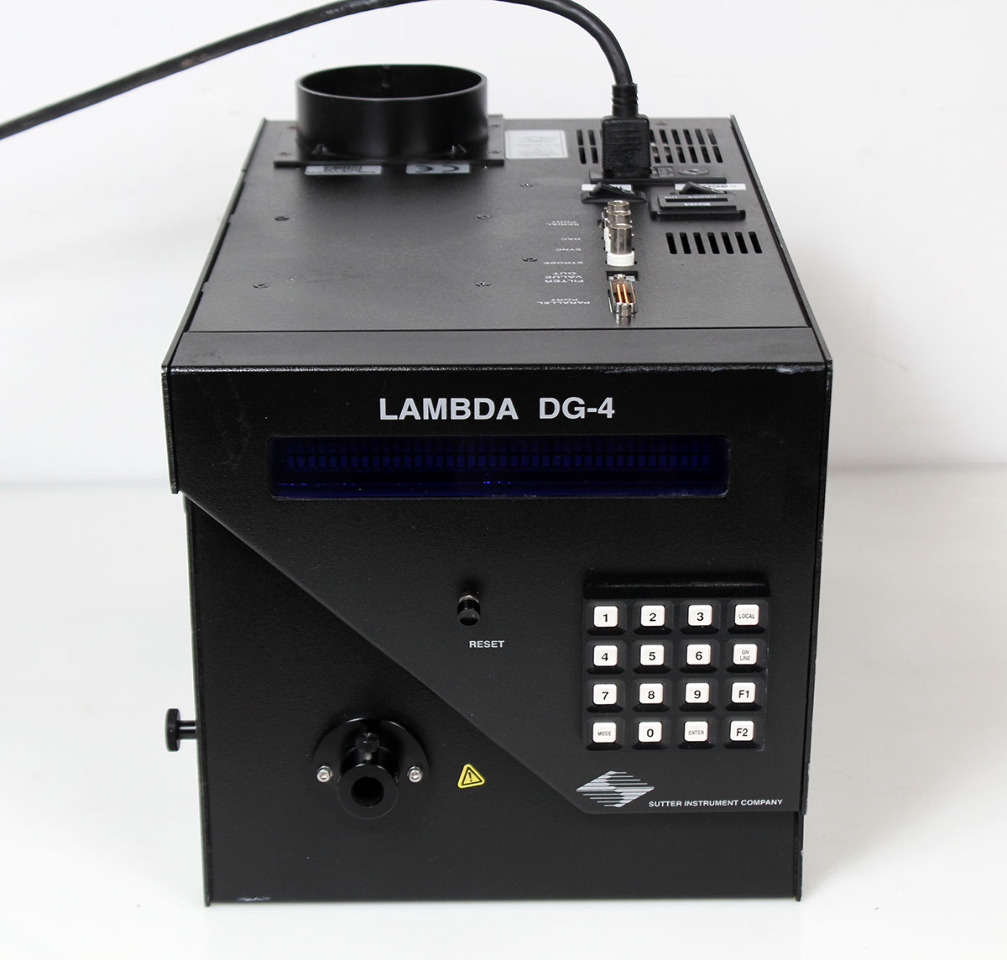 The Sutter Instrument Lambda DG-5 is an ultra-high-speed wavelength switcher and light source designed for fluorescence microscopy, capable of switching between 5 different wavelengths in approximately 500 \(\mu \)s. It uses a 300 W xenon arc lamp, allowing fast, precise excitation changes, ideal for ratiometric imaging. The system integrates a filter changer and a light source, often utilizing a liquid light guide for coupling.