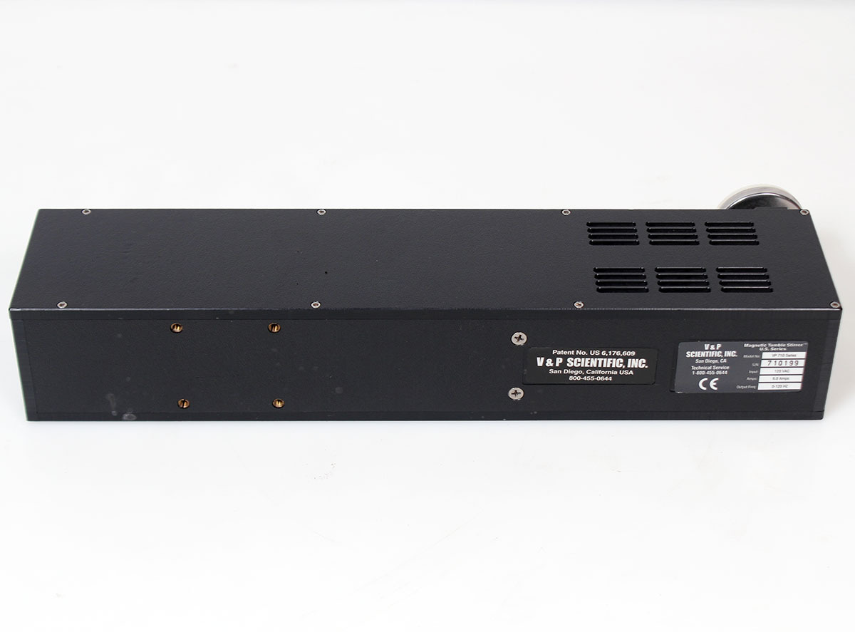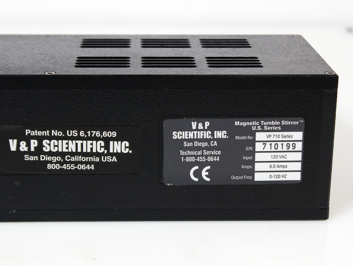 The V&P Scientific VP-710C1-ALPFX is a specialized Lateral Tumble Stirrer used in high-content screening applications, such as suspending parasite larvae (somules) in media. It is a component of the V&P Scientific VP 710 series, designed to create a vortex in multiple vessels simultaneously.
