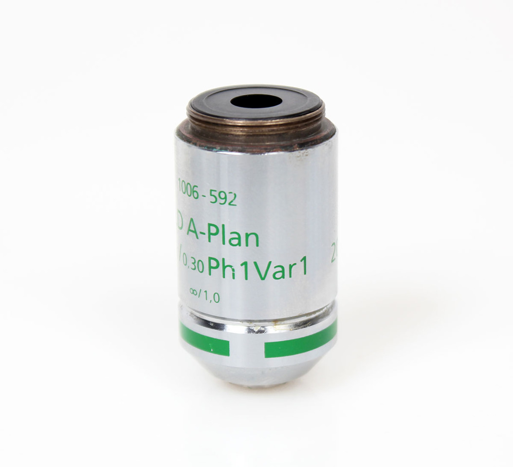 The Zeiss LD A-Plan 20x (Part #1006-592) is a Long Distance (LD) infinity-corrected objective for inverted microscopes, designed for cell culture vessels (like petri dishes) with a 1.0mm thick polystyrene coverglass, offering a 4.3mm Working Distance, a 0.30 Numerical Aperture, and Phase Contrast (Ph1 Var1) capability, providing good contrast and a flat field for routine life science imaging.