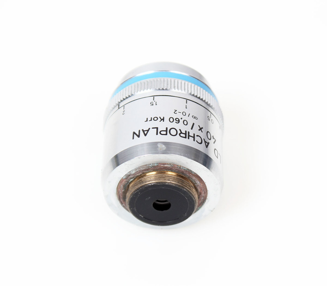 The Zeiss LD Achroplan 40x/0.60 Korr is a long-working-distance microscope objective designed for various microscopy methods, including brightfield and fluorescence, and features a correction collar for cover glass thickness adjustments.