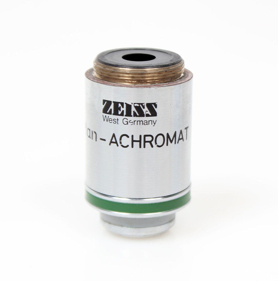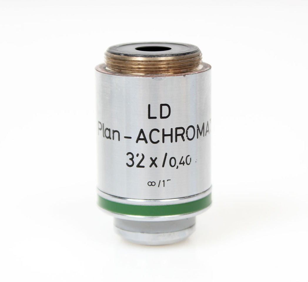 The Zeiss LD Plan Achromat 32x (Part #440850) is a long working distance, infinity-corrected objective for inverted microscopes, featuring 32x magnification, 0.40 Numerical Aperture (NA), RMS thread (0.8" / 20.32mm), a flat field (Plan Achromat) for sharp images, and correction for cover glass up to 2mm thick (or thinner with cap) for brightfield/phase contrast, designed for cell culture imaging.
