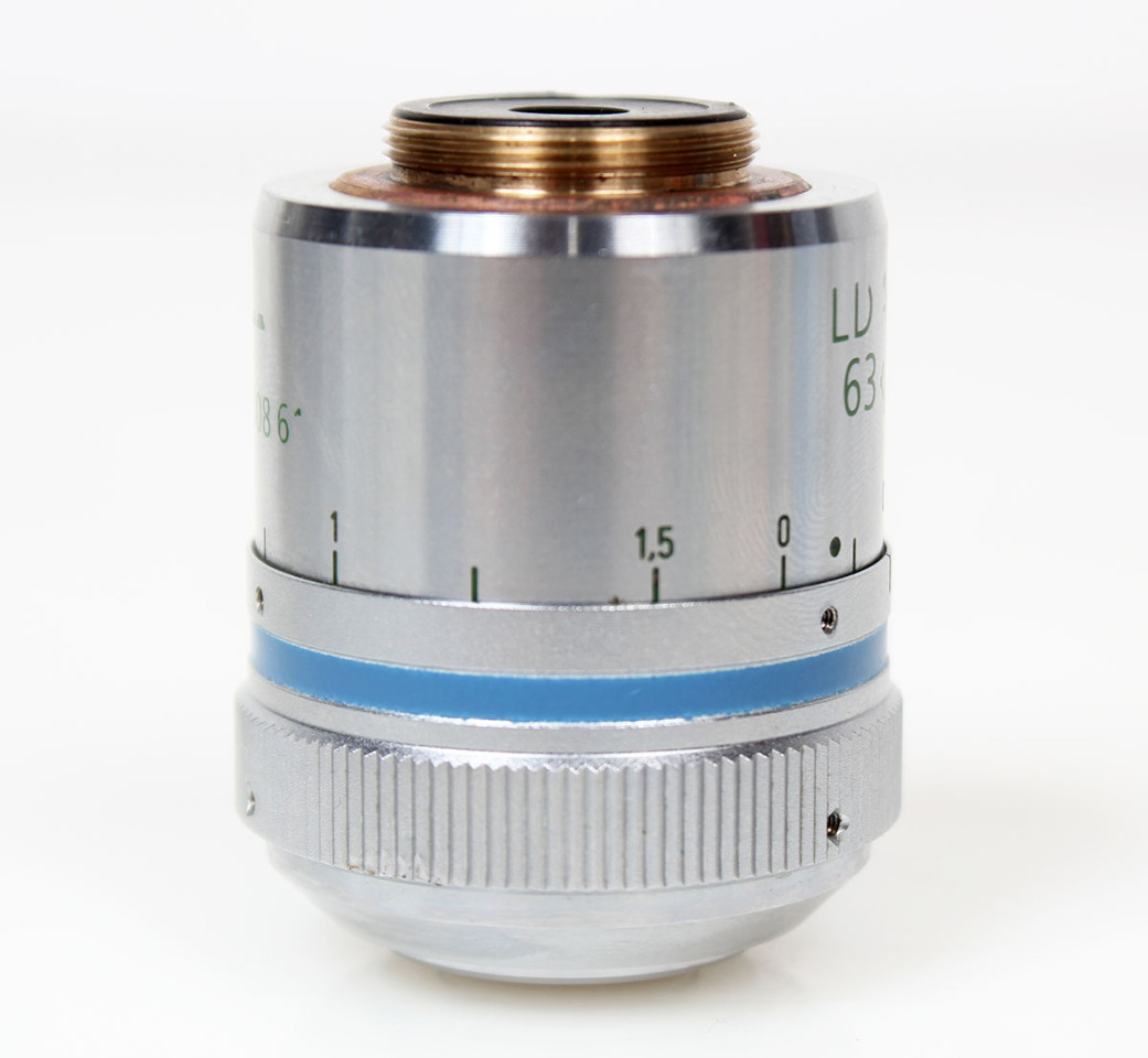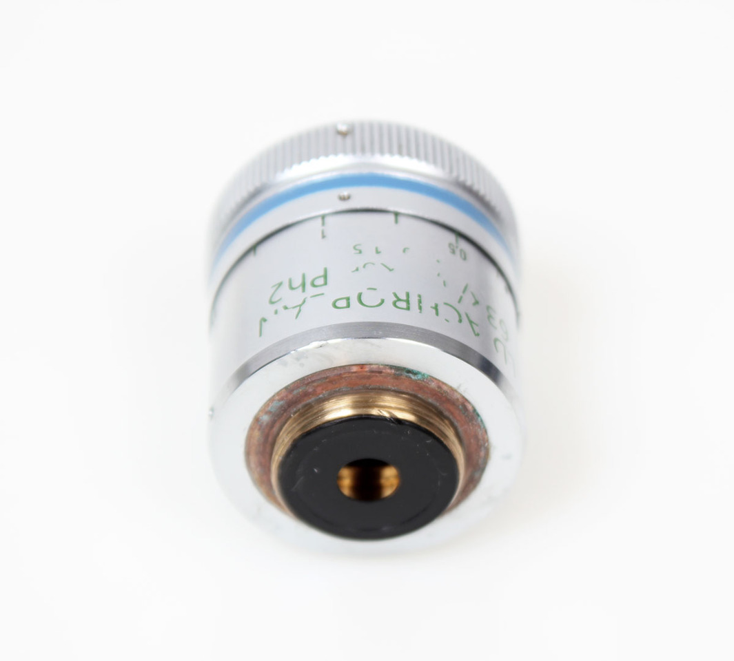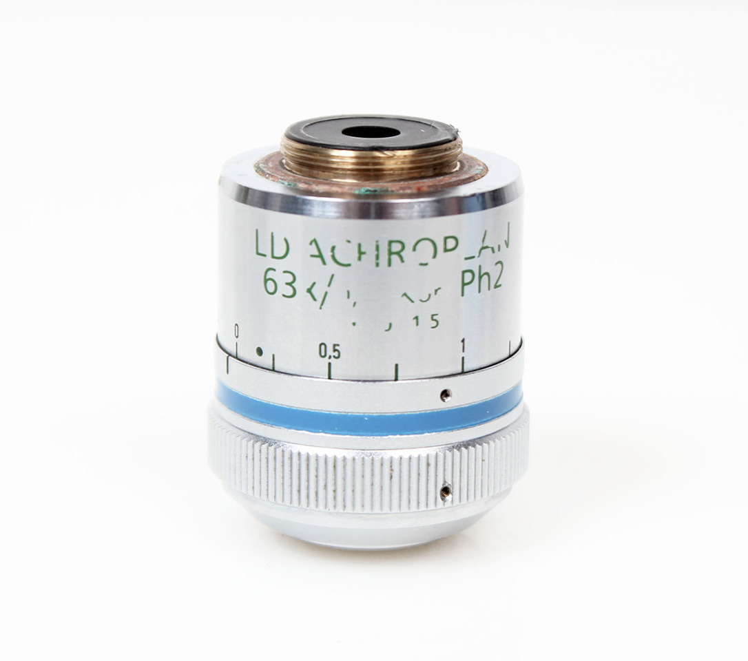 The Zeiss Achroplan 63x Korr Ph2 is a high-performance microscopy objective for routine and epi-fluorescence, featuring 63x magnification, a standard 0.17mm cover glass correction (CG), and a 0.75 Numerical Aperture (NA) for LD (Long Distance) versions, offering good flatness (up to 23mm field diameter) for clear imaging through cell culture vessels.